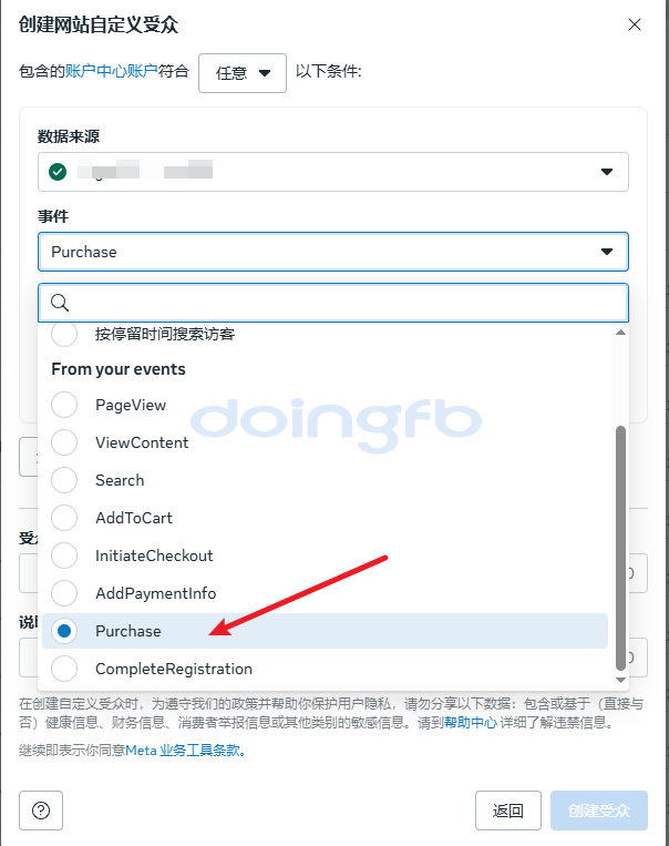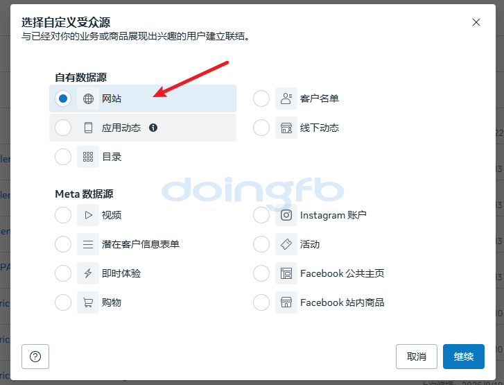 1.在受众管理工具里先创建一个自定义受众,数据来源可以选择「网站」