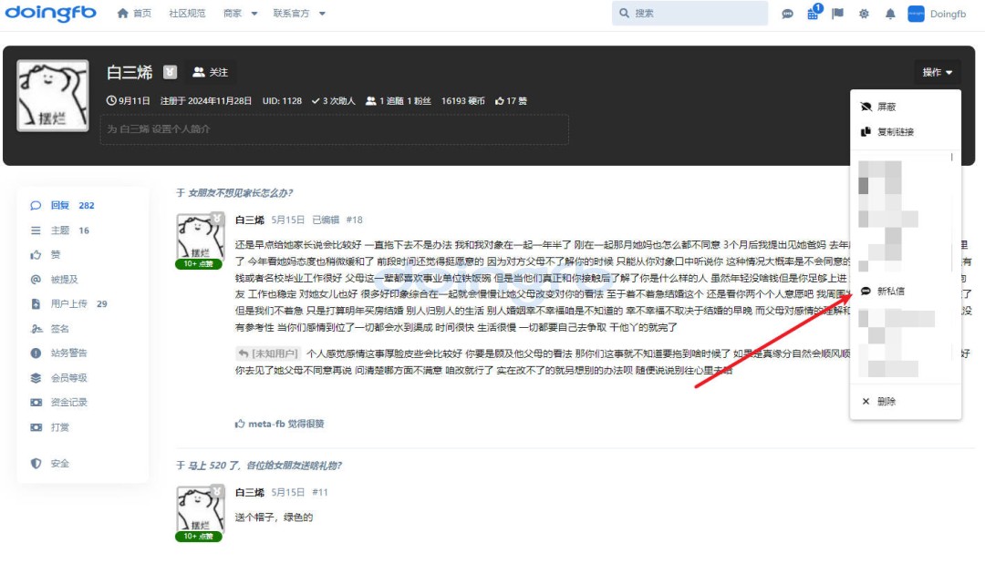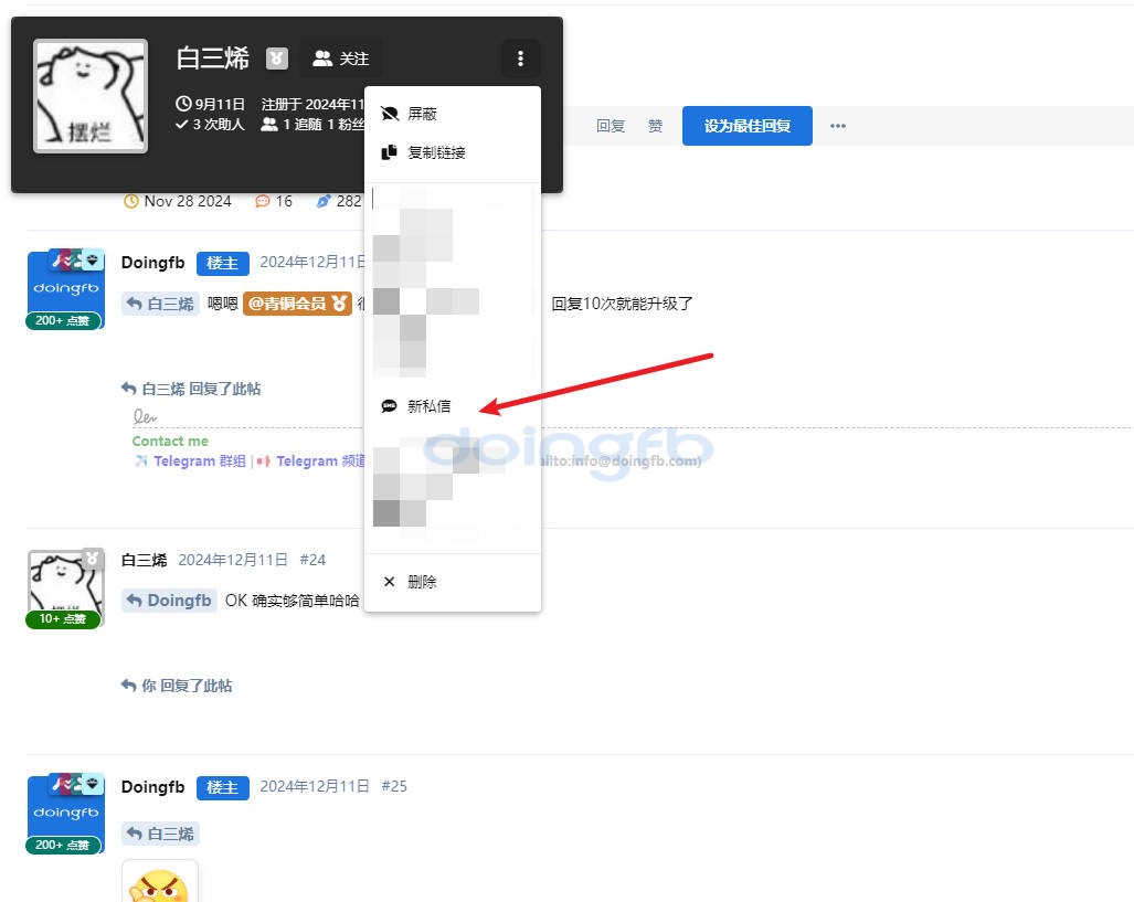 Doingfb 私信联系方式: 1️⃣ 将鼠标移到对方头像或名字上,点击出现的“三个点(…)”,选择「新私信」即可联系。 2️⃣ 点击对方头像进入个人主页,在左侧「操作」栏中找到并点击「新私信」按钮即可。